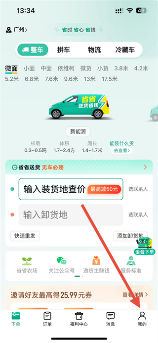 1、在省省回头车首页,点击右下角我的进入个人页面。