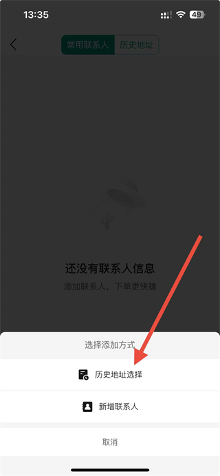 4、在弹出的选择添加方式中,可选择历史地址选择或新增联系人,按提示填写地址后完成设置。