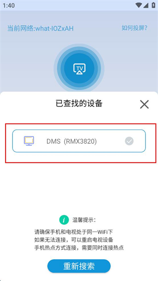2、在已查找的设备列表中,选择对应的设备选项,完成与电视设备的连接。