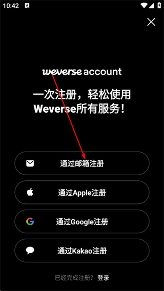 1、在Weverse启动界面,点击注册选项,进入注册方式选择页面。