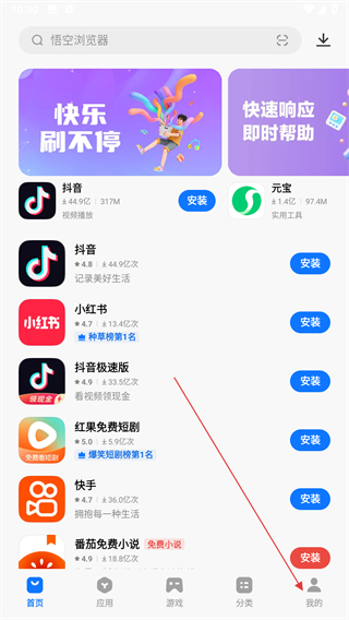 1、打开vivo应用商店进入首页,点击底部导航栏的我的选项进入个人界面。