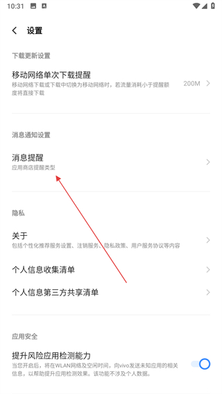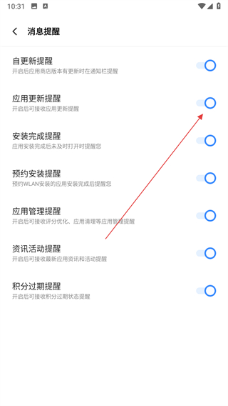 4、在消息提醒界面找到应用更新提醒选项,点击对应的开关按钮即可开启该功能。