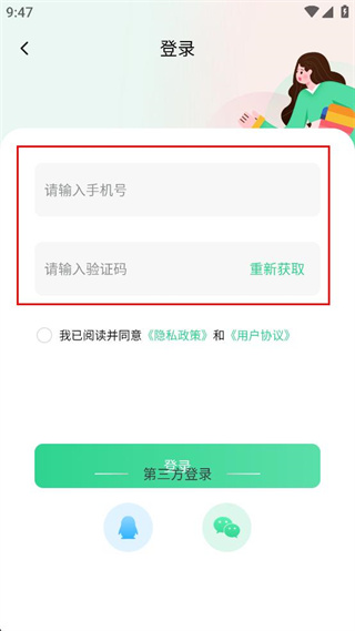 3、在登录界面依次填写手机号和验证码,完成对应的信息输入操作。