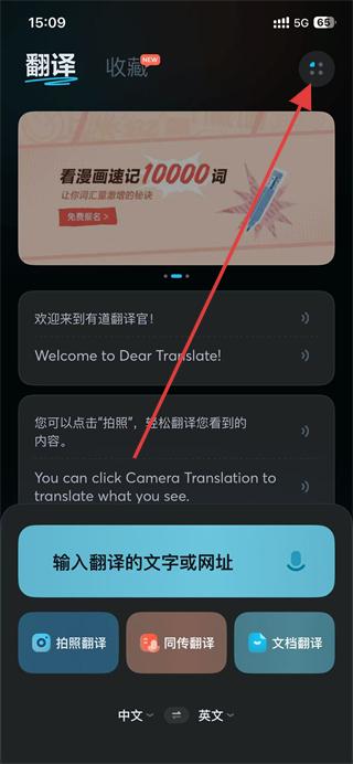 1、打开有道翻译官,点击页面右上角的按钮,进入功能菜单页面。