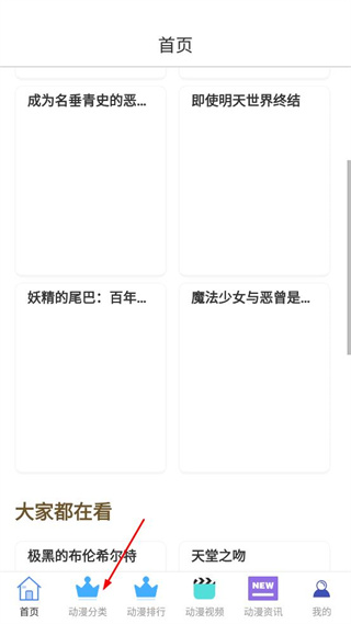 2、进入应用首页,找到底部导航栏的动漫分类选项,点击该选项进入动漫分类页面。