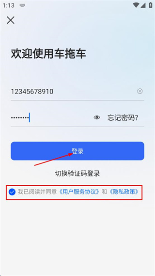 4、勾选同意用户服务协议和隐私政策的选项,点击登录按钮完成账号登录流程。