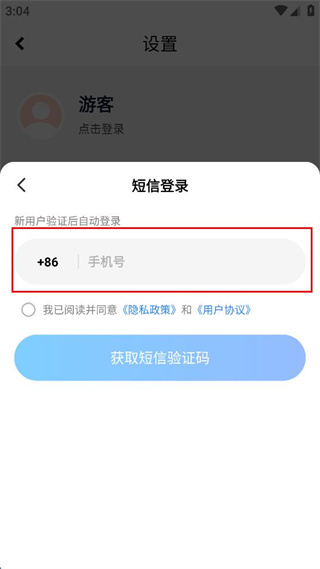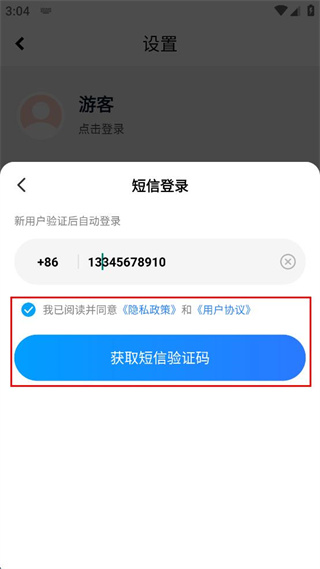 4、勾选同意隐私政策和用户协议的选项,点击获取短信验证码按钮继续操作。