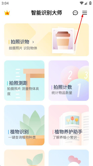 1、打开智能识别大师软件,进入主界面查看各类识别功能,点击右上角菜单按钮。