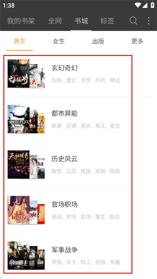 3、在书城的男生分类下,浏览玄幻奇幻都市异能等书籍类别,挑选感兴趣的书籍。