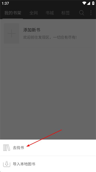 2、在弹出的选项中选择去找书选项,进入书城界面查看各类书籍分类。