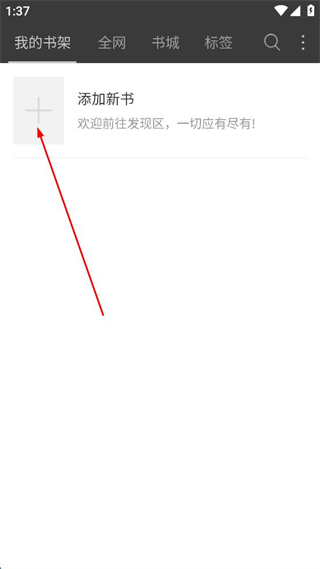 1、打开图书阅读类软件,在我的书架页面点击添加新书旁的加号按钮,调出操作选项。
