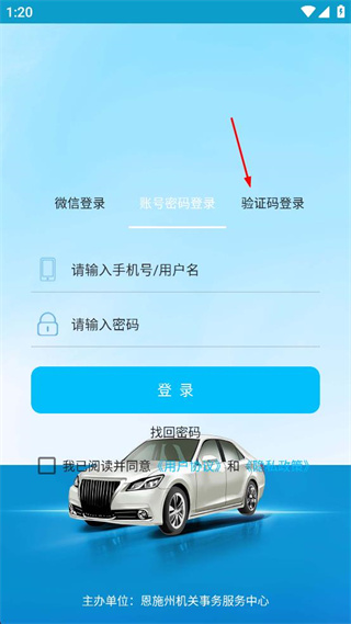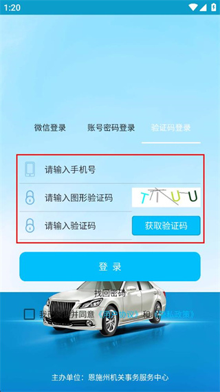 1、点击验证码登录选项,切换至验证码登录界面,填写手机号,输入图形验证码,再点击获取验证码后填写收到的验证码。