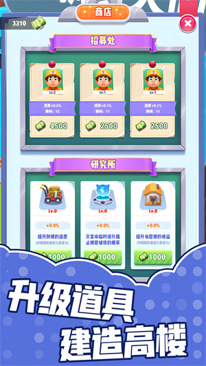 随着不断升级,火柴人也会逐渐变得更加聪明、勤奋,可以通过收集和利用各种宝石、金币等来升级自己的技能和手工艺,招募更多的工人,让他们帮忙建造房屋。