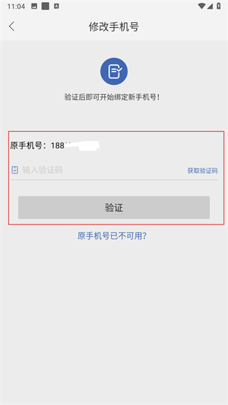 3、在修改手机号页面点击获取验证码,输入原手机号收到的验证码后点击验证。