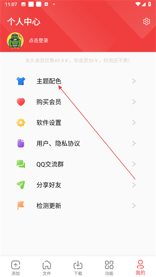 2、在个人中心页面的功能列表里,找到主题配色选项并点击,跳转至主题选择的页面。