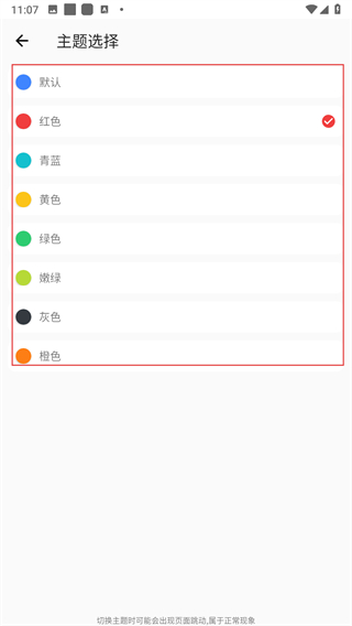 3、在主题选择页面中,从默认红色青蓝等选项里,挑选想要更换的主题颜色并点击。