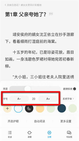 3、在阅读界面,点击下方设置选项,弹出设置菜单。