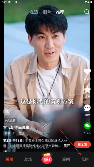 1、打开河马剧场的APP,进入推荐页点击右下角我的图标。