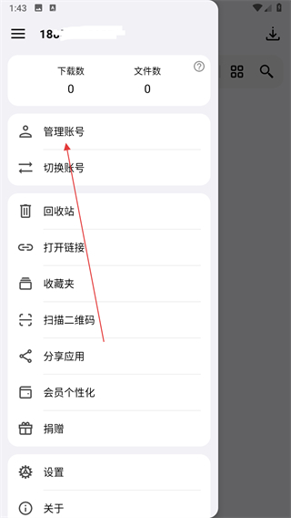 2、在功能选项中找到管理账号选项,点击后弹出账号的子菜单。