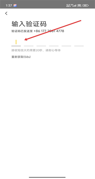 4、在跳转到验证页面中,点击输入框填写收到的短信验证码,即可完成登录。