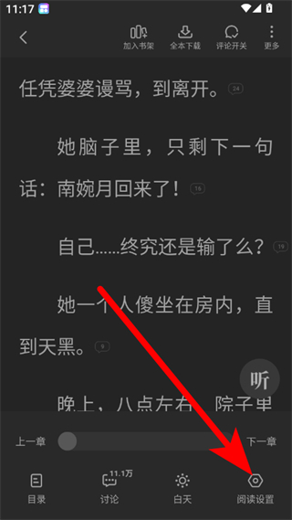 2、在小说阅读界面,点击阅读设置选项,进入阅读设置页面。