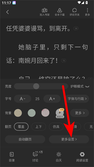 3、在阅读设置页面,点击更多设置选项,进入更多阅读设置界面。