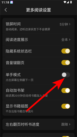 4、在更多阅读设置界面,开启单手模式开关,即可启用单手阅读功能。