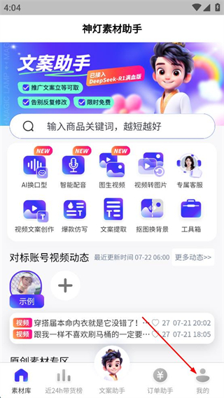 1、打开神灯素材助手首页,点击页面底部右侧的我的选项,进入个人中心页面。
