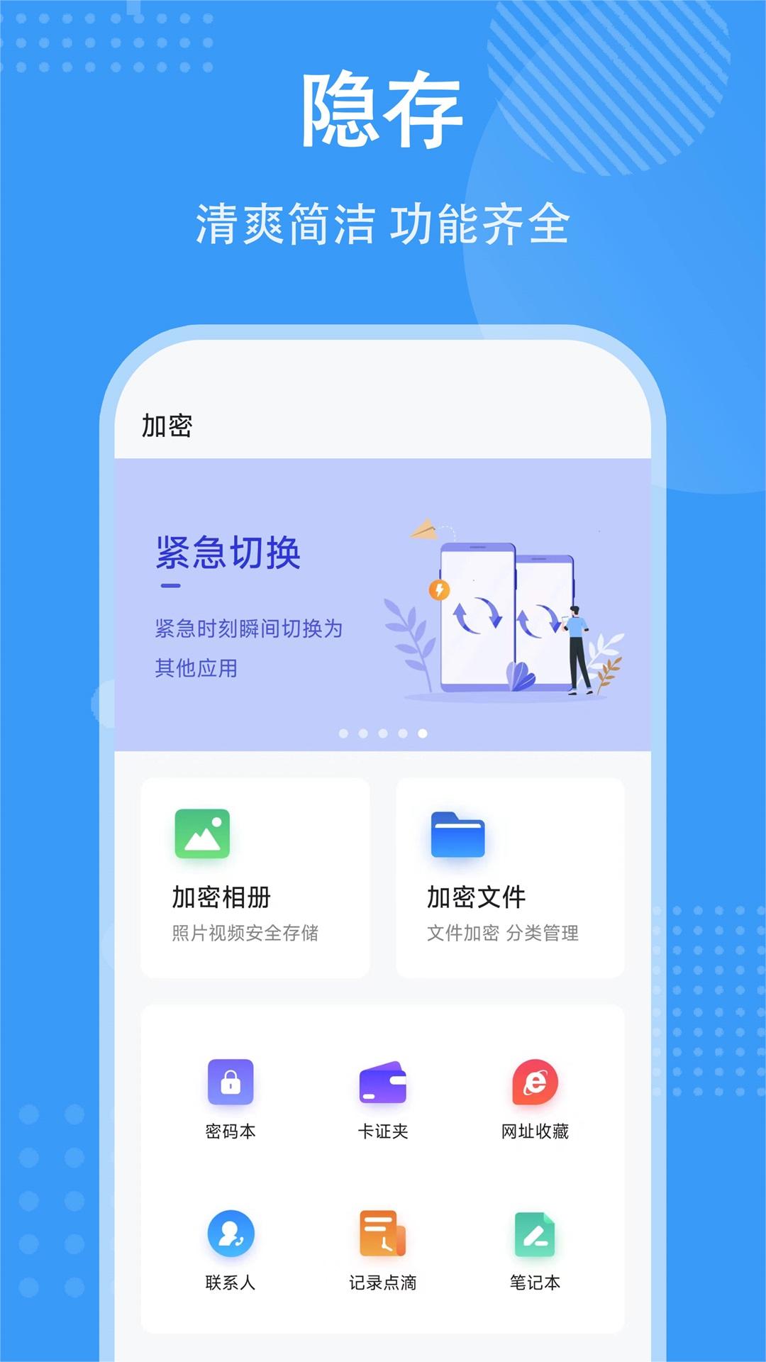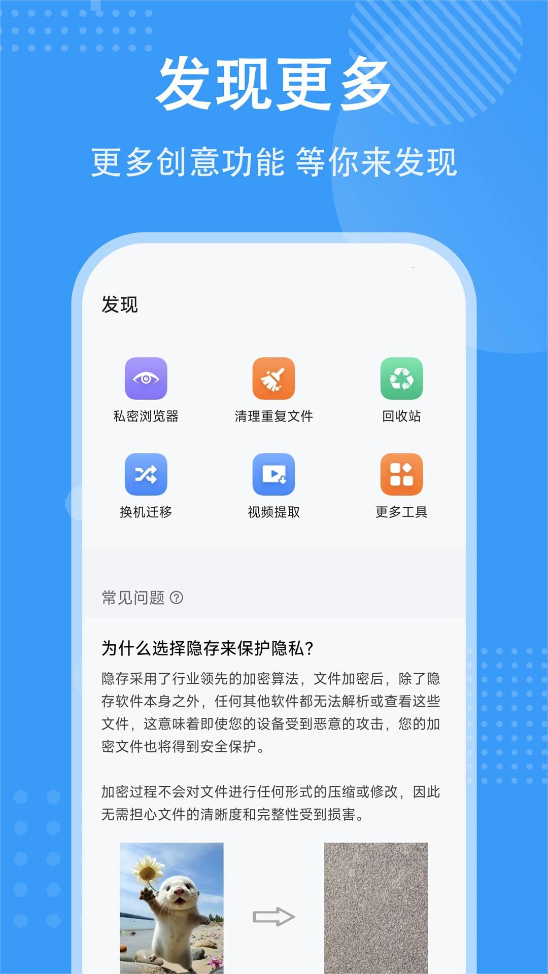 隐存软件为用户们提供了能全面保护个人隐私安全的软件,为用户们带来了全方面的信息安全储存和私密安全管理的服务支持,并在针对隐私的功能中实现常用的安全保护,同时还拥有多种媒体处理工具的使用,在针对如今的媒体处理的工具中进行自由化的设置处理使用,面对如今的处理上支持对于图片压缩、添加水印、视频倒放和视频转换成为GIF格式等,操作更是非常的简单。