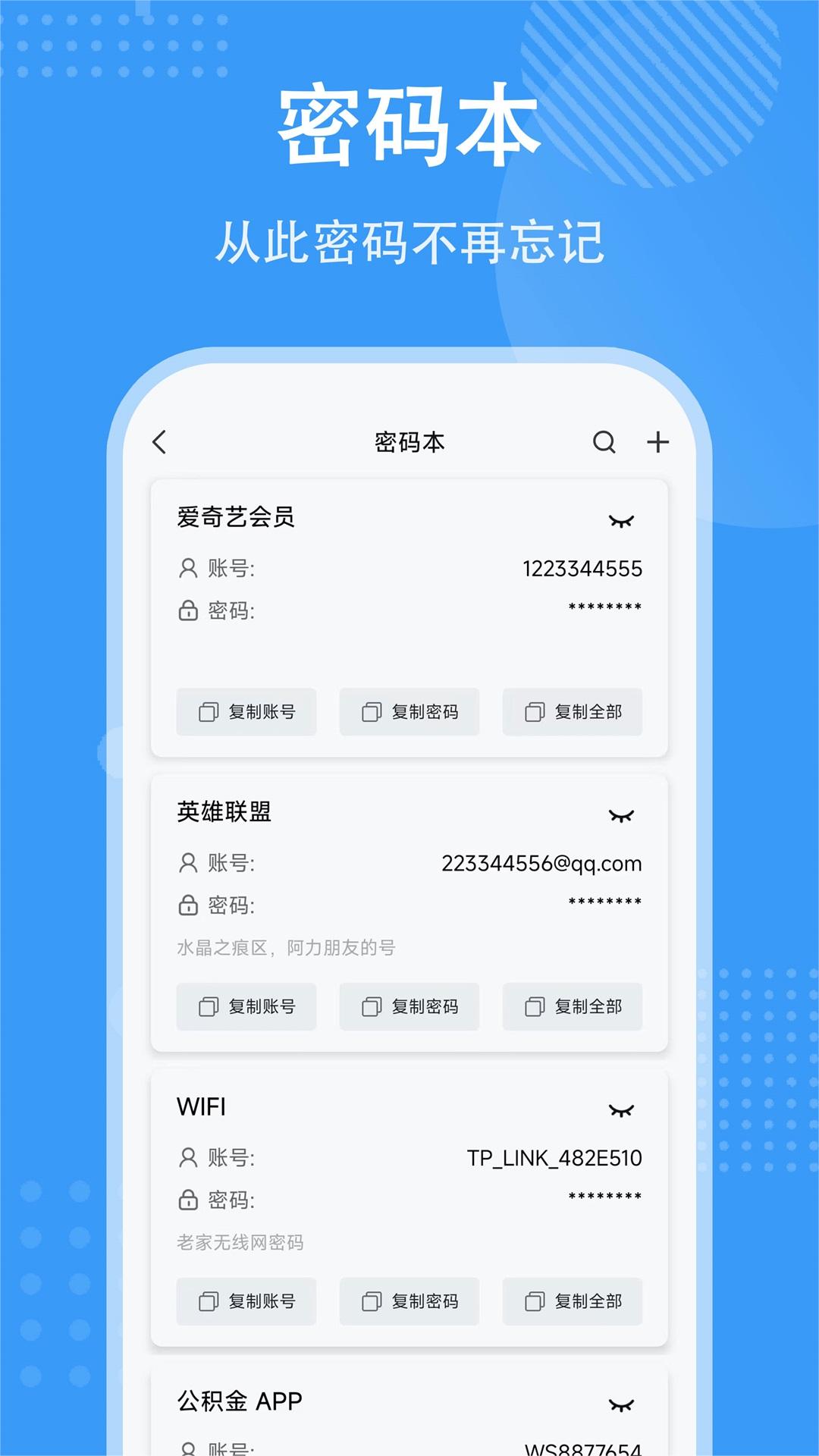 3、安全的储存各种类型的密码并进行管理,告别如果忘记密码的尴尬问题;
