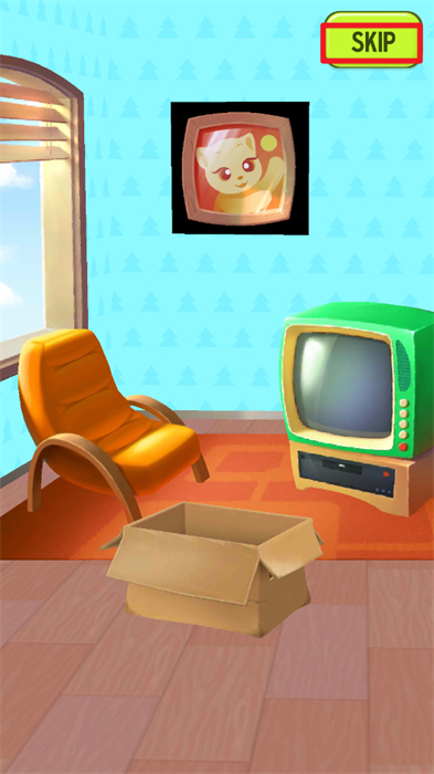 1、进入到游戏的场景内之后,将可以在屏幕上看见一个纸箱子,这个纸箱子内装着的是你的哈基米,可以点击以进行收取,收取完毕后可以点击屏幕右上角的【skip】按钮来进行背景故事的跳过;
