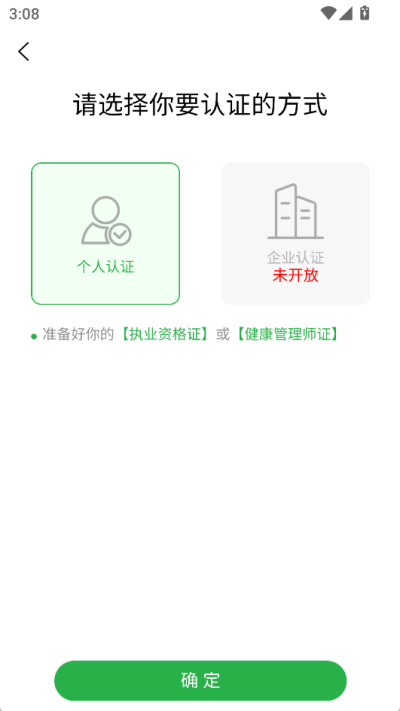 3、然后选择自己的认证方式,目前仅支持个人认证,需要准备好你的执业资格证和健康管理师证;