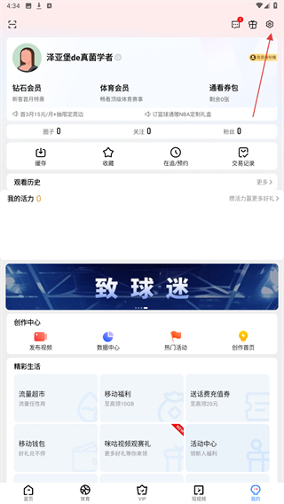1、打开咪咕视频APP,在首页内点击右下角我的图标。