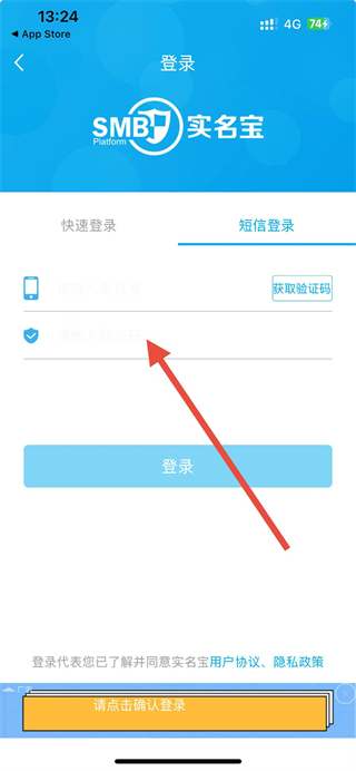 4、在短信登录界面,填写手机号码,获取验证码,确认信息无误后,点击登录完成操作。