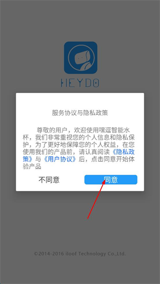 1、打开嘿逗智能水杯应用,在服务协议与隐私政策弹窗中,点击同意按钮进入相关页面。