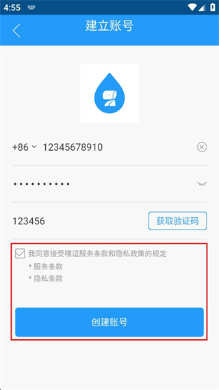 4、勾选同意相关条款,点击创建账号按钮,即可完成嘿逗智能水杯的账号注册。