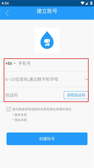 3、在建立账号界面,依次填写手机号密码,点击获取验证码后填写对应内容。