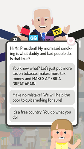 总统竞选模拟是一款画风精致且充满卡通趣味的休闲模拟手游,为你开启别具一格的总统选举体验之旅,在游戏构建的选举世界里你将化身为参与总统选举的关键人物,而获取人民的选票、拥有超高人气是通向总统宝座的必经之路。