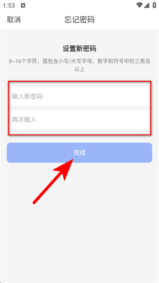 4、输入并确认新密码后点完成,完成萤石派账号密码找回操作。