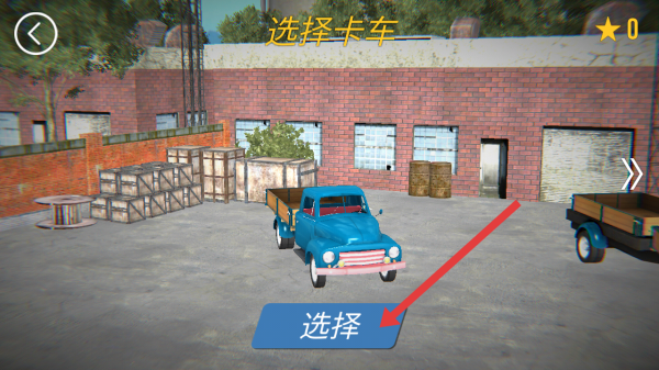 1、在起重卡车模拟器的车辆选择界面,点击蓝色卡车下方的【选择】按钮,选定该卡车开启运输任务。