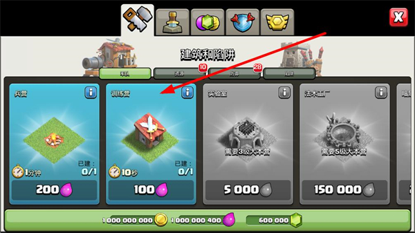 2、在商店的建筑和陷阱分类下,找到要建造的建筑,确认资源足够后点击该建筑选项。