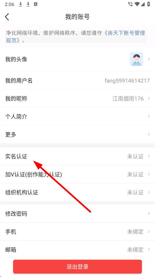 3、在该界面中,找到实名认证选项并点击,进入我的账号页面的认证相关区域。