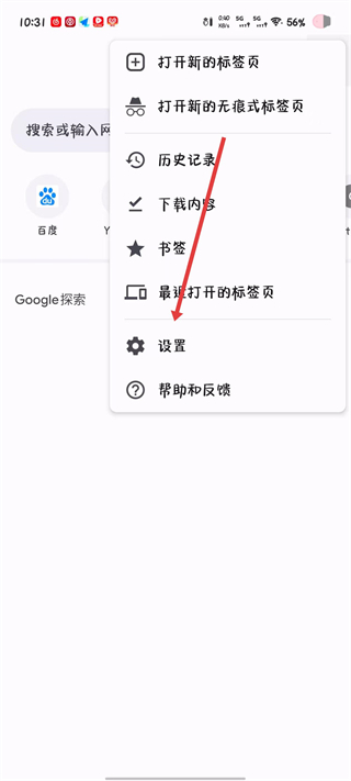 2、在弹出的功能菜单中找到设置选项并点击,进入浏览器的设置操作界面。