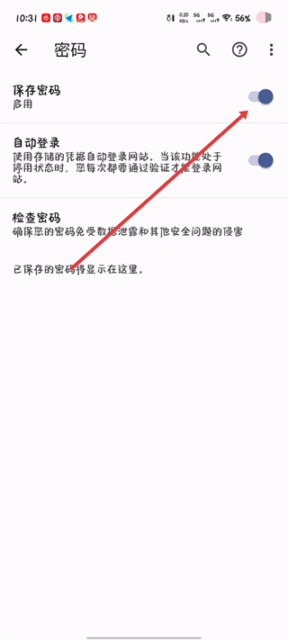 4、在密码设置页找到保存密码选项,点击其右侧的开关按钮将功能切换为启用状态。