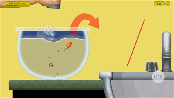 3、用界面方向键操控小鱼移动,尽量让小鱼处于红色鱼食的中心位置,同时合理使用BOOST键提速,提升拾食效率以加快成长。