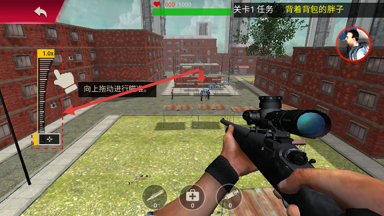 1、左手滑动调整瞄准镜倍率,右手点击射击按钮,手抖的话目标会笑你三年。