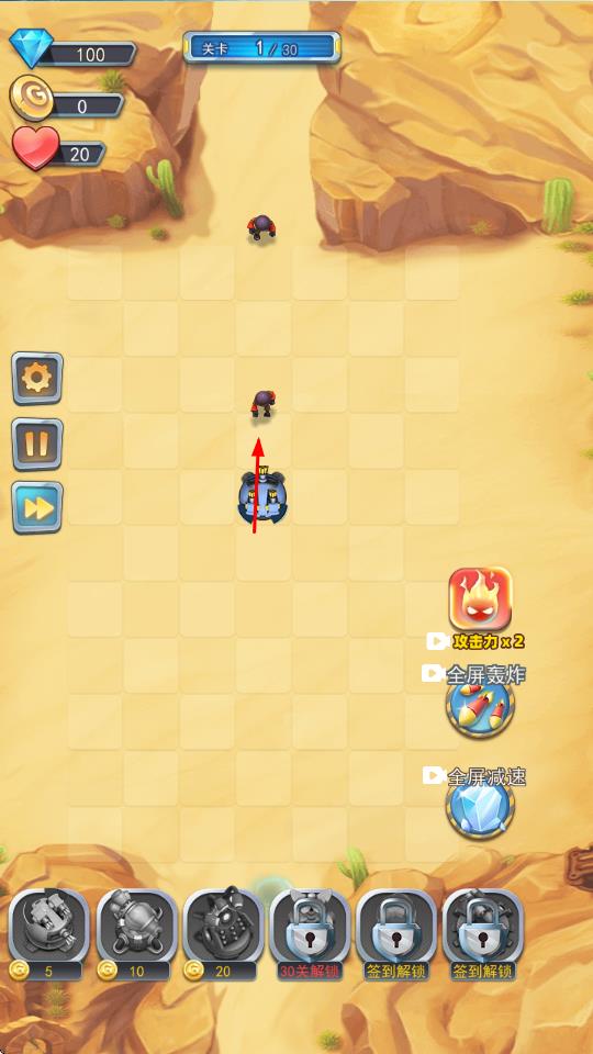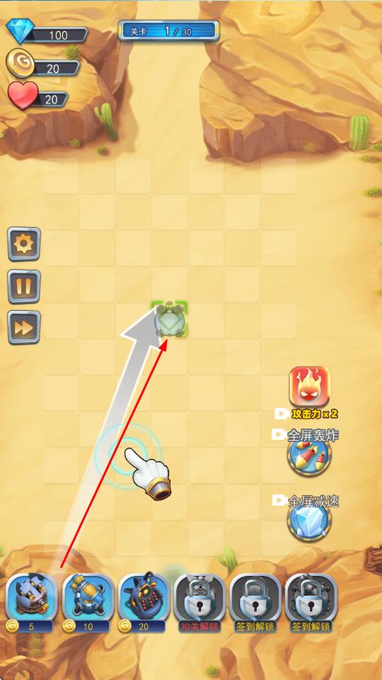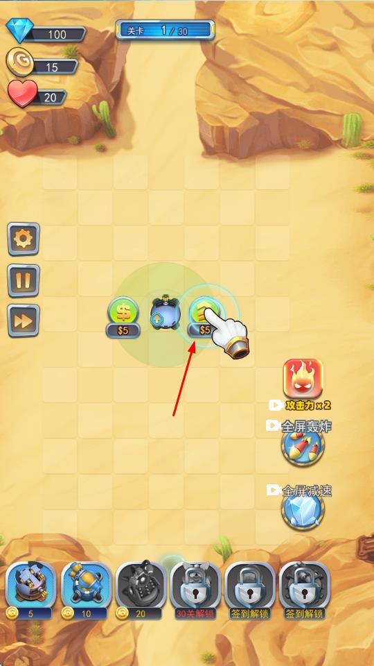 1、“布置机甲塔”,消耗金币(5、10等),在沙漠路径旁放置机甲塔,构建防御。