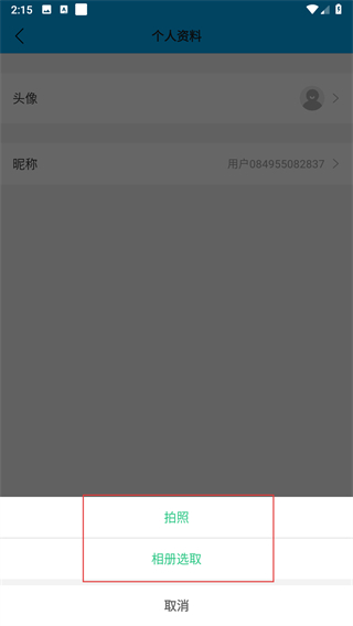 3、在个人资料界面中,点击头像选项,弹出拍照和相册选取的操作选项菜单。