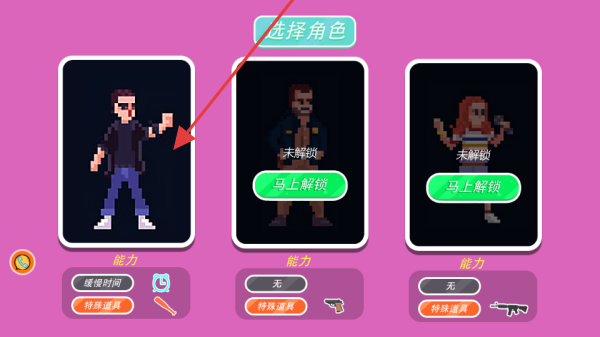 2、在角色选择界面,选择已解锁的角色,其能力为“变慢时间”,拥有“特殊道具”,也可选择解锁其他角色获取不同能力。