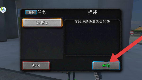 1、根据任务提示”去收集”,描述“在垃圾场收集丢失的钱”,点击【开始】接取收集类任务选择场景。